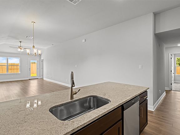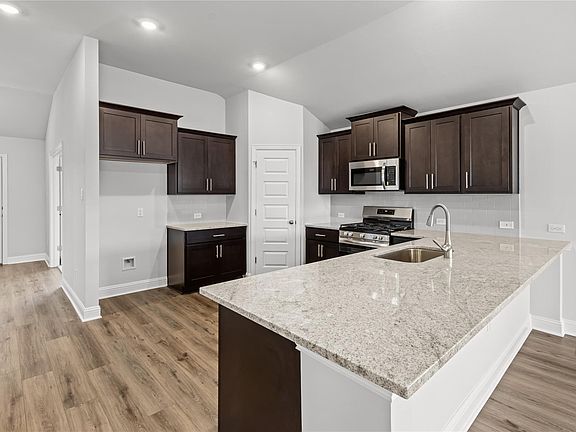 Inside, enjoy the warmth of luxury vinyl plank flooring throughout, with plush 800 Dove carpet in the bedrooms. Elegant touches like 5-inch baseboards and a tray ceiling in the primary suite add refined character. The open-concept layout boasts a spacious living area and a modern kitchen with granite countertops and crown molding atop the cabinetry—ideal for everyday living and entertaining.