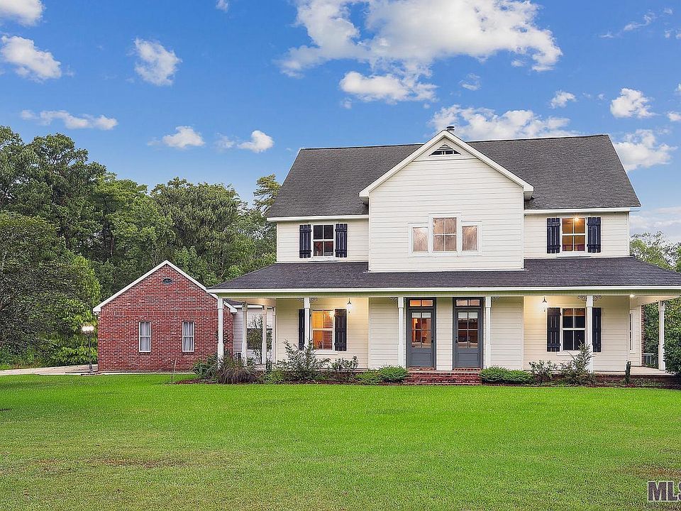 Southern Living at its best with lots of room to roam! This wonderful 2 story home is sitting on 8.29 acres (approximately 1.50 acres is usable & the remaining property considered wetlands). As you enter the driveway, you’ll be impressed with the beautiful wrap-around porch and quickly begin imagining your morning & evening sits in your rocker, while soaking up the peace and tranquility of country living. If you love to cook and entertain, you will love this spacious kitchen. It’s open to the living and sunroom! The living room boast tall ceilings and a cozy fireplace to warm up to on chilly days. A large, separate dining room is located off the kitchen and living room for all your Holiday gatherings! You will love relaxing in the sunroom which is overlooking the outdoor pool. Off the sunroom is a large room that can be used as a game room or second family room. Downstairs also offers three bedrooms, 2.5 baths and laundry/utility room. Upstairs, is 1 large bedroom with a full bath + another room that could be used as a bedroom/office & also a smaller space that can be used as a sitting area/play space or office. Find more peace & tranquility in the backyard with an inground pool, extra concrete decking, and your own pond. Home has never flooded and is NOT in a flood zone. New roof installed & completed on 9/14/23. Highly rated Maurepas school as another bonus. Don’t miss your opportunity to call this one home!