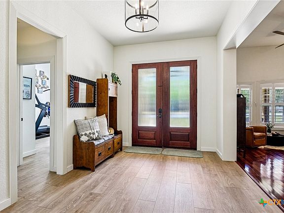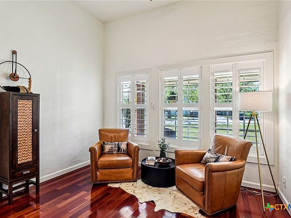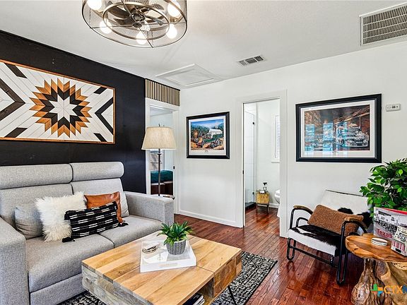 This beautifully expanded 4-bed, 3-bath home blends vintage character with modern updates in a prime New Braunfels location. Originally built in 1953, the home features preserved original hardwood floors and a cozy mid-century vibe in the original 850 sq ft wing. A 2008 addition expanded the home to 2,424 sq ft, offering spacious, light-filled living areas. Recent 2024 updates include a fully renovated kitchen and primary bath with sleek, modern finishes. Custom louvered shutters and updated lighting add timeless elegance throughout. The functional layout includes 2 bedrooms in each wing — ideal for multi-gen living or guest flexibility. A standout 4.5-car detached garage (added in 2009) provides exceptional space for hobbies or storage. Additional upgrades: HVAC replaced, air purification system added, and new insulation installed (April 2025). Just minutes from historic Gruene, this one-of-a-kind home offers space, style, and substance.