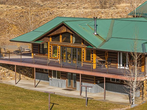 This captivating residence commands attention with its grand scale and rustic details. Expansive front windows frame breathtaking views of the Ruby mountains. Thoughtfully designed to harmonize with its surroundings, the home features nature-inspired textures and earthy tones, including corrugated tin siding paired with fir log accent. Built in 2011, this home offers open concept kitchen and living room, four bedrooms plus a bonus room easily utilized as a fifth bedroom, 3 bathrooms, spacious dining room with a bar, gym, & large laundry room. The kitchen is a chef's dream, equipped with stainless steel appliances, durable non-porous Corian countertops, and soft-close cabinets. For hobbyists or mechanics, the massive garage/shop includes a storage loft and additional living quarters. Test your green thumb in the large greenhouse. This home is a true masterpiece of comfort and craftsmanship.