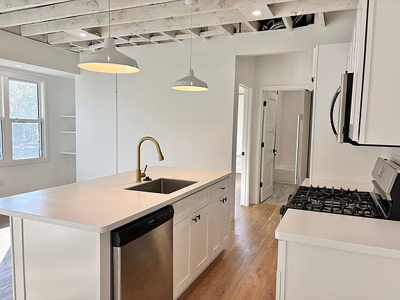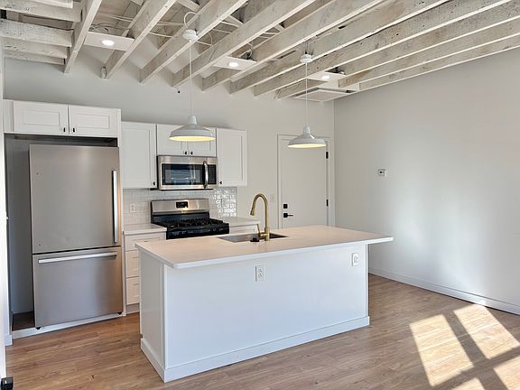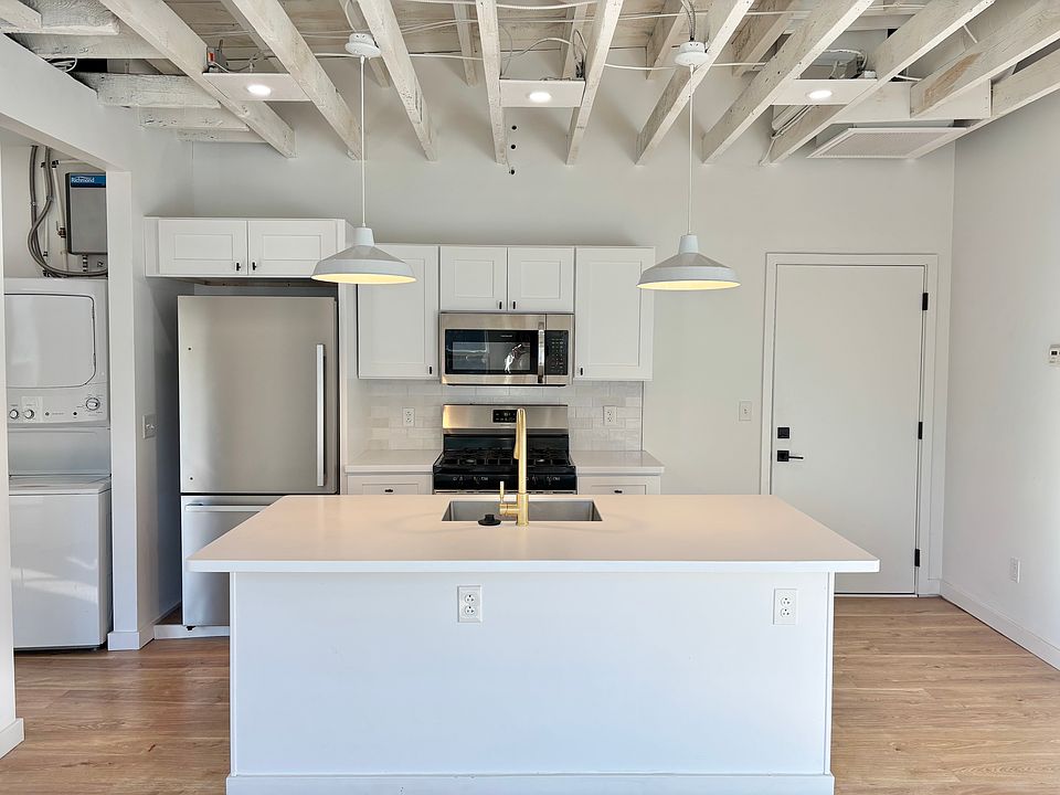 The unit has south facing windows across the open concept living area and kitchen and in the bedroom. Updated Kitchen featuring a large eat-in island with room for 3 barstools. Exposed brick, open rafters and high ceilings throughout. Updated bathroom with extra storage space. Washer/dryer in unit. One off street parking space available (new parking pad being poured, may not be complete by time of move in). Pet friendly, one pet maximum.