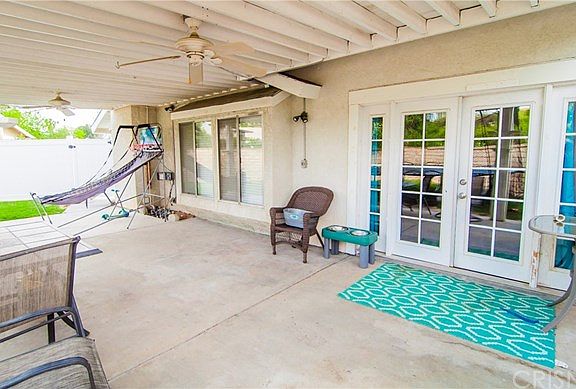 One of a kind expanded single story on a large, private lot. Located on a great cul-de-sac. This home was expanded to open up the master bedroom and add a huge family room off the kitchen. The kitchen has granite counters, stainless appliances and travertine floors and a breakfast bar that opens up to the family room. Newer wood-like flooring throughout living and family rooms. Baths have granite counters. French doors lead from the family room to a large, covered patio and an open grassy area with total privacy. Indoor laundry area. 2 car attached garage. Great neighborhood with No HOA, no Mello Roos. This one won't last long!!