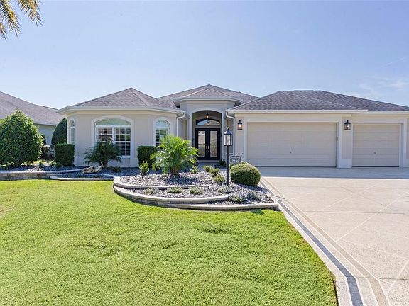 Experience luxury living in this stunning Expanded Avalon Premier model, perfectly situated in the Village of Pinellas. This rare find offers 4 bedrooms, 3 full baths, and 2,823 square feet of living space, plus a 3-car garage (2-car plus 1-car). Brand new HVAC just installed. One of the bedrooms has been transformed into a spectacular private home theater with a tray ceiling—complete with its own full bath with a large shower, and walk-in closet. Murphy bed available separately. You’re first greeted by an impressive entrance that opens to a welcoming foyer. Beyond it lies a gracious dining room with wainscoting and a solar tube light, perfect for hosting festive dinner parties with friends. Afterward, unwind in the spacious living area showcasing a custom entertainment center. The gourmet kitchen is sure to impress the most discerning chefs. This open design features an oversized wraparound counter that can seat a crowd, plus a central island for added prep space. You’ll love the granite countertops, abundant white cabinetry with over cabinet lighting and pullouts, a pantry with pullouts, stainless steel appliances, built-in oven, cooktop range, recessed lighting, and an additional solar tube for natural light. Just beyond, a cozy breakfast nook opens to a south-facing glass-enclosed lanai—ideal for morning coffee, leisurely afternoons, or evening cocktails under the glow of a Villages sunset. The primary suite is a serene retreat featuring an impressive tray ceiling and laminate flooring. The spa-inspired ensuite offers separate granite vanities, a soaking tub, Roman shower, private water closet, and a massive custom closet designed to impress. A guest wing includes one bedroom with a custom office setup and laminate flooring, with space for a queen-size sleeper sofa, while another serves as a private fitness suite. A full guest bath with a large shower and a spacious linen closet completes this area. Additional highlights include designer paint palette, tile flooring in main areas, crown molding, tall ceilings, and plantation shutters throughout. The inside laundry room is thoughtfully designed with extensive cabinetry, a utility sink, granite folding station, built-in desk, and LG washer and dryer. A private door adds convenience and privacy. The garage is finished with an epoxy floor, attic stairs, and ample cabinetry. Outside, the impressive entrance area features remote screening for outdoor enjoyment, while the entrance and driveway showcase an attractive painted finish. Enjoy refreshed, professionally designed landscaping with accent lighting, and a spacious side yard—ideal for a future pool or spa. This home truly has it all. Perfectly located between Brownwood Paddock Square and Lake Sumter Landing, you’ll enjoy easy access to golf, pickleball, swimming, country clubs, recreation centers, shopping, dining, medical facilities, and more. Discover the ultimate Villages lifestyle—where luxury, comfort, and community meet.