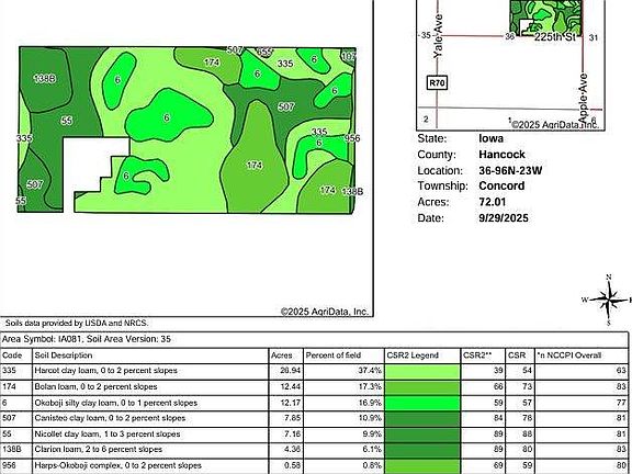 -AUCTION DECEMEBER 2ND 10:00AM- Tract 2 is a versatile property encompassing approximately 80 +/- acres, ideally situated about 5 miles southwest of Ventura, Iowa, and 6 miles southeast of Garner, Iowa. This tract features 72.32 +/- acres of productive tillable cropland, making it well-suited for agricultural operations. An old building site is also present on the property; with clearing, this area could potentially add an additional 4 acres of tillable farmland, further increasing the tract's agricultural value. Additionally, the farm includes two natural gas pipeline easements, which are important to consider for both current land use and future planning. Overall, this tract presents a strong opportunity for expansion or investment in a prime Iowa farmland location. The public auction will take place on December 2, 2025, at 10:00 AM, and interested bidders are invited to participate in person at UP 4 Celebrations. Don't miss your chance to be a part of this historic event and invest in a legacy property that has been cherished for generations. Online bidding will open November 24, 2025. • 80 +/- Deeded Acres • 77 +/- Taxable Acres • 72.32 +/- Tillable Acres • CSR2 of 60.5 • Prominent Soil Types: Harcot clay loam, Bolan loam & Okoboji silty clay loam • Approximately 1 mile off hard surface county R70 • Corner of Apple Ave & 225th St • Immediate possesion after closing • Near Ventura, IA • Section 36 of Concord TWP • Real Estate Taxes $1,650