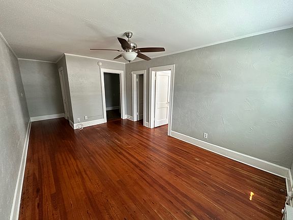 From the moment you walk in, you'll be surprised at how spacious this 1 bedroom is. There is a separate large bathroom complete with a tub, and tons of counter and cabinet space in the kitchen. This apartment has been painted all in a neutral grey that showcases the crown molding and tall baseboards. Talk about charm! The kitchen has a cool vintage ironing board cabinet that has been converted to a built-in spice rack and has just enough room to put a bistro table or a baker's rack. This is a 1st floor unit with a separate entrance and several large windows to allow for plenty of sunshine. Ceiling fans assist the built-in a/c units in keeping it cool.