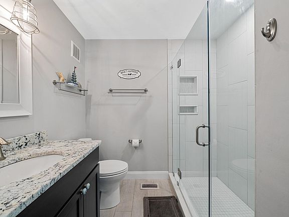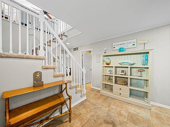 This spacious five bedroom, two and a half bath townhouse is located just a stone's throw from town and a leisurely stroll to the beach. The first floor features a ceramic tile foyer, four bedrooms and a recently renovated bathroom. There is also a conveniently located laundry room just off the foyer. Vaulted ceilings and an open concept living space are featured on the second floor. The great room combines a comfortable living area, dining area and updated kitchen with bar seating. The expansive primary bedroom boasts a freshly remodeled en-suite bathroom, designed to create a personal haven for relaxation and privacy. The fenced back yard includes a spaced grassy area for recreation, an outdoor shower, and additional storage areas.