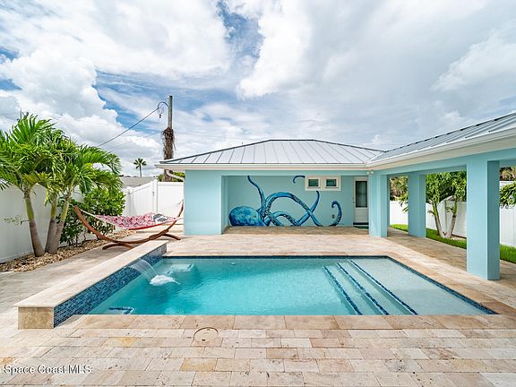 Heated saltwater pool with waterfall, & separate in law suite/efficiency dwelling. Every inch styled with art by renowned Cocoa Beach artist Eric LaMar—turnkey, unforgettable, and wildly Instagram-able. All furnishings included.