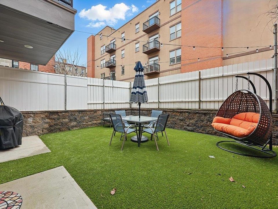 A NEW STANDARD OF LUXURY IN DOWNTOWN JC. Discover the pinnacle of modern living in this exquisite two-bedroom, two-bathroom home, nestled in the heart of downtown Jersey City. Built in 2023, this 1,027sqft residence blends contemporary elegance with thoughtful design, featuring wide-plank hardwood floors, oversized windows, and high-end finishes throughout. The gourmet kitchen is a chef’s dream, outfitted with Fisher & Paykel appliances, Calacatta quartz countertops, and sleek cabinetry. The primary suite offers a spa-like retreat with a walk-in shower, double vanity sinks, and a generous walk-in closet. A spacious second bedroom provides flexibility for guests, a home office, or personal sanctuary. Step outside to your expansive 540sqft private backyard—a rare urban oasis perfect for entertaining or unwinding. Additional conveniences include Nest-powered central HVAC and an in-unit washer/dryer. Situated in an elegant boutique building, this home is just moments from Grove Street PATH, Whole Foods, Van Vorst Park, and top-rated dining, placing the best of Jersey City at your doorstep. Parking available at 110 First St garage for $210/mo (1 block away).