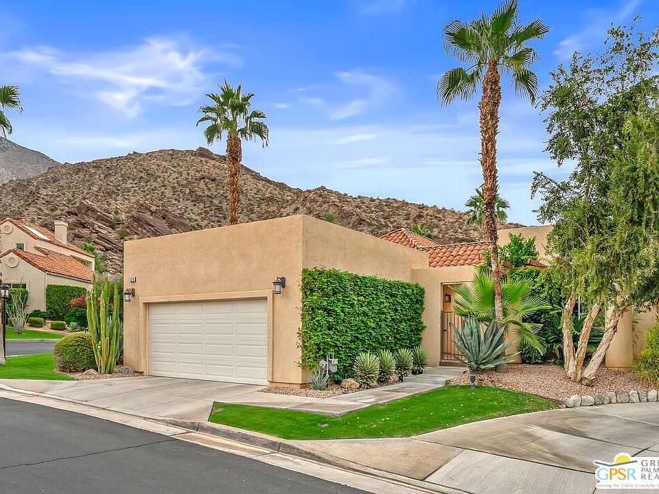 Palm Springs 2 bedroom 2 bath condominium, 2102 square feet of living space on FEE land (No Land Lease). Located in the community of Canyon Heights offering stunning panoramic views of the surrounding desert landscape and is known for its natural beauty, tranquility, and upscale living. Inside, an open concept floor plan- living room, dining, kitchen and breakfast room with quartz countertops, updated appliances (built in wall ovens w/convection) microwave, dishwasher, Wolf gas cooktop and designer hood vent. Walk in pantry, kitchen island, and dry bar. Two generous size ensuites, suite one with extra large walk in closet, stall shower and soaking tub with double sided fireplace to bath and bedroom. Suite two with private bath and generous size room. This property lives like a single family home, is in move-in ready condition upgraded with: vinyl flooring throughout, ceiling fans, recessed lighting, built ins, dry bar, stone accent walls, remodeled baths, dual zone a/c, dual pane windows, smart thermostats, customs window treatments, two car garage, two outdoor private terraces with stunning mountain views. The Canyon Heights community offers resort style living with pools/spas, tennis/ pickle-ball courts, clubhouse, fitness room, putting green, and gated access to the Lykken hiking trail & Oswit Canyon Preserve, two golf courses nearby, this is a perfect Palm Springs lifestyle property, very reasonable HOA fees, and a well maintained community on FEE LAND (no lease). Conveniently located close to downtown Palm Springs, which offers a variety of shopping, dining, and entertainment options.