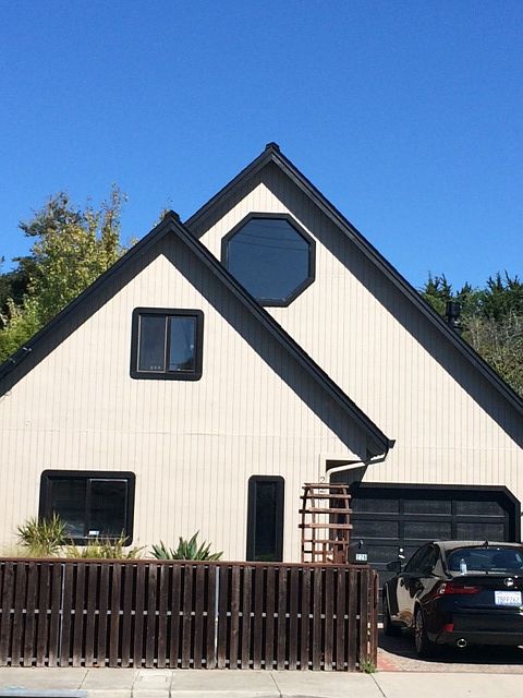 Charming chalet-style home, easy stroll to Seacliff Beach, and nearby shopping, restaurants. Reverse plan: two bedrooms two baths on entry level. One bedroom, half-bath, office, kitchen and LR upstairs. Kitchen updated and open to LR. Master bath has stall shower & separate tub. Enjoy fireplace in LR on rainy days, or rooftop deck on sunny days. Fenced yards, rear patio.