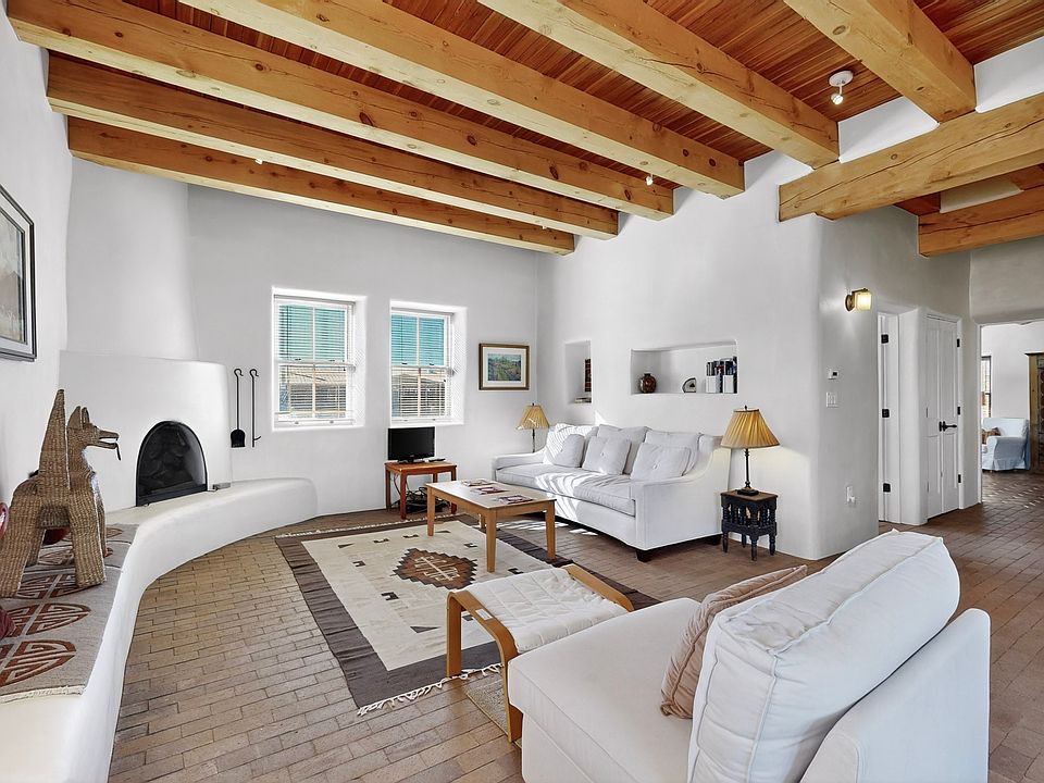This custom-built Adobe home has spectacular views and easy access on 3.28 acres of premium irrigated land! Offering peace and privacy just minutes from the heart of Truchas, NM, this home is rich in history and character. The current owners thoughtfully expanded the original footprint of an adobe farmhouse while preserving the historic details authentic character and solid structure. Features include handcrafted plaster walls with nichos, vigas, beams, soaring high ceilings and gabled windows. The brick, saltillo, and white oak flooring with radiant heat creates warmth and authenticity while a classic kiva fireplace anchors the living space. Both bathrooms feature walk-in showers, with a soaking tub upstairs and a private sauna downstairs for comfort and relaxation. With community water supplemented by valuable ditch rights, the fully fenced pastures are well-suited for horses or small-scale farming and an old log barn in the pasture speaks to the history of the land and offers flexible use for storage and animals. Set against the backdrop of the Truchas Peaks, this distinctive Southwestern adobe retreat enjoys beautiful views of the mountains and surrounding hillsides. The oversized garage offers additional room for a workshop with attic storage above. If you are seeking a horse property, a mountain getaway, or a full-time residence that embodies the charm of Northern New Mexico this home is not to be missed!