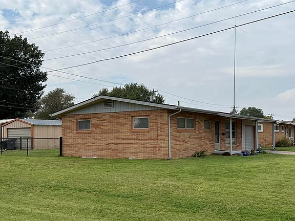 Charming Brick Home on a Spacious Corner Lot with Additional Garage Space!! This lovely property showcases fantastic curb appeal right from the start. The covered porch invites you in, leading to a living room featuring a large north~facing window. Adjacent to this space is a spacious eat~in kitchen, equipped with plenty of cabinets and countertops. An added bonus is that the kitchen appliances will remain with the property!! The main floor offers a full bathroom, 2 bedrooms, plus bonus space with laundry hook ups, also offering a great space for office or den area. Completing the main floor, fantastic shelving for pantry located just off the kitchen in walkway to attached garage. The full basement offers additional living space, 2 non~conforming bedrooms, ½ bath, plus storage room with a shower stall. Additional highlights include central heat and air, excellent storage, updated roof, 1~car oversized attached garage with extra~wide driveway, fenced yard with new black chain~link fence, extra~large metal detached garage\shed with electricity, concrete floor, and adjoining garden shed This delightful brick residence sits on corner lot approx. 71 x 112. Close to numerous amenities, just to name a few, Larned Elementary School, playground, walking trail, and Larned Community Center..