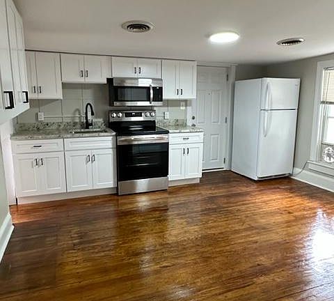 Beautiful new kitchen cabinets and granite counters in this spacious eat-in kitchen with new high-arc faucet and black cabinet pulls. New stainless steel microwave and range with air fryer oven. Spacious newer white refrigerator. Small pantry off of kitchen and an additional storage closet in kitchen. Nice size living room and two side-by-side bedrooms. One full bath with ceramic pedestal sink. Second half-bath also has a pedestal sink and shelving for toiletries. Original hardwood flooring throughout this spacious and open apartment. Bonus storage off of living room. Shared hallway and a private laundry area that has a washer/dryer for each apartment. Quiet and quaint apartment convenient to downtown but far enough on the East end of town from the hussle and bussle.