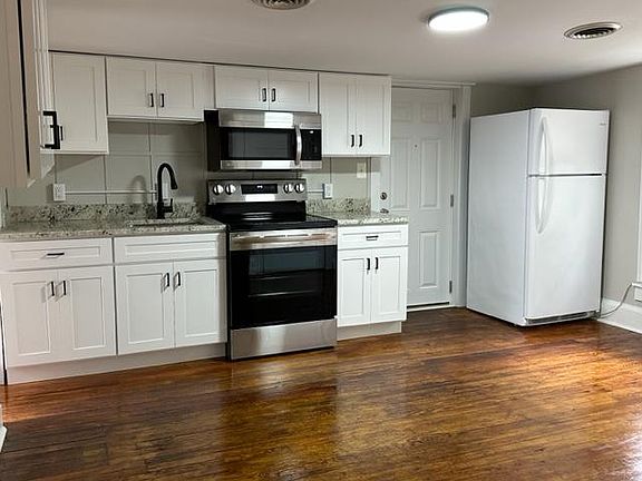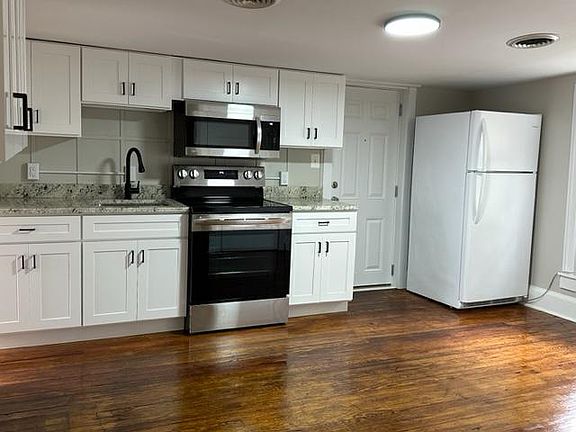 - Exterior features: 1 and 1/2 bath, Freshly painted neutral gray with bright white trim & doors, Front and rear entry, Garbage included in rent, Granite counters, New high-arc faucet with single bowl stainless sink, New kitchen cabinets with black hardware, Sewage not included in rent, Storage room off of living room, Water not included in rent