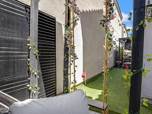 Enjoy a seamless indoor-outdoor lifestyle. with a multi-slide glass door that opens to your private, low-maintenance side yard oasiscomplete with an extended patio, custom lounge swing, TV setup, putting green, and cozy sitting areaan entertainer's dream under the Arizona sky. Just steps away from the community pool and park.