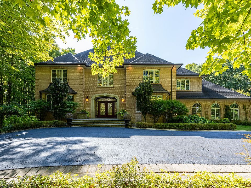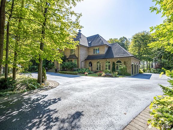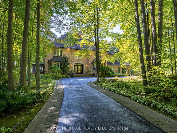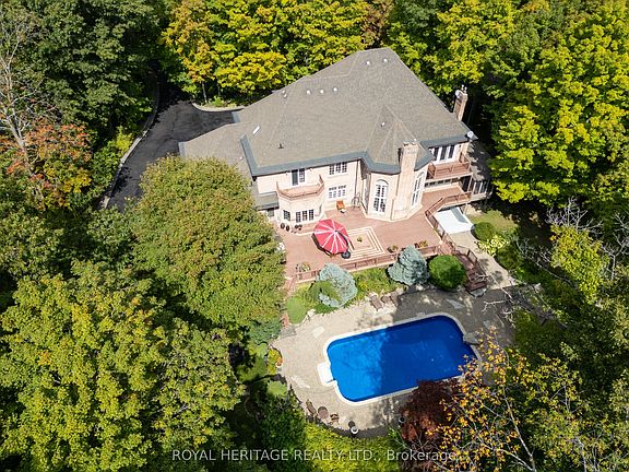 Welcome to your private retreat. This luxurious family home sits on a beautifully landscaped 1.27 acre lot, with plenty of trees for privacy and a resort style feel. Striking open concept living room has soaring two-story ceilings, a grand centre floating staircase, marble floors, gas fireplace and floor to ceiling windows overlooking the backyard. The elegant dining room has coved lighting and a butlers pantry connecting to the chefs kitchen, which offers high-end appliances, granite counters and a walk out to the composite deck, with a beautiful view of the pool. Dedicated home office has a large bay window and custom wood cabinetry. You'll love the additional family room with more custom wood work, a gas fireplace, and walk-outs to both the sunroom and back deck, perfect for multi-season entertaining. The second level has an expansive primary suite with a luxurious 5 piece ensuite, walk through closet with custom built-ins as well as a gas fireplace and walk-out to a private deck. Four additional large bedrooms, completed by three full bathrooms, is ideal for large families or overnight guests. The fully finished basement boasts a massive recreation room complete with dry bar and full second kitchen. The walk-up to the backyard provides seamless indoor/outdoor living. Additional private guest room has its own ensuite. The spa-inspired area offers a sixth washroom, change room, sauna and indoor hot tub (as is) -- your own private wellness retreat. The salt water pool is surrounded by lush gardens, interlock patios and a fully equipped pool house with pop-up serving window and two additional changerooms. A rare blend of sophistication, comfort and outdoor luxury, perfectly designed for those that love to entertain, relax and enjoy the finer things in life. Whether you're hosting summer pool parties, family holidays, or enjoying quiet evenings by the fire, this property offers a lifestyle unlike any other.