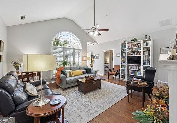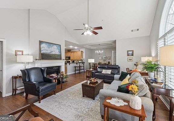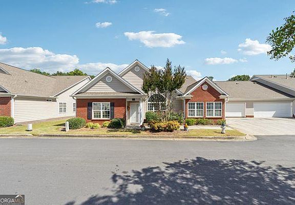 Simply a Must See! Located in a 55+ gated community convenietly located within minutes of entertainment, shopping centers, stores, medical facilities and downtown Woodstock. Low maintenance, leisure living to live life to the fullest. This spacious home is filled with beautiful hardwood floors, plantation shutters throughout along with being flooded with natural light, built-in microwave, gas stove and brakfast bar. Enjoy meals in the dining room with a beautiful tray ceiling and french doors leading into the cozy and inviting sunroom. The livning room boasts and open and airy feel with its vaulted ceiling and gas fireplace. The large primary bedroom features a vaulted ceiling, sitting area, huge walkin closet complete with shelving and storage. The primary bathroom boasts double sinks with a large shower. The two secondary bedrooms are spacious and has plenty of closet space. The large 2 car garage has plenty of space inside and additonal driveway parking outside. The HOA responsibilites include: Pest control, maintain exerior of each home, termite bond, yard maintenance, common area maitenance, grounds maintenance, trash, roof. Make sure to check out the club house which has monthly activities for residents.