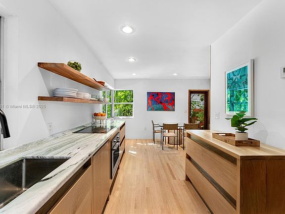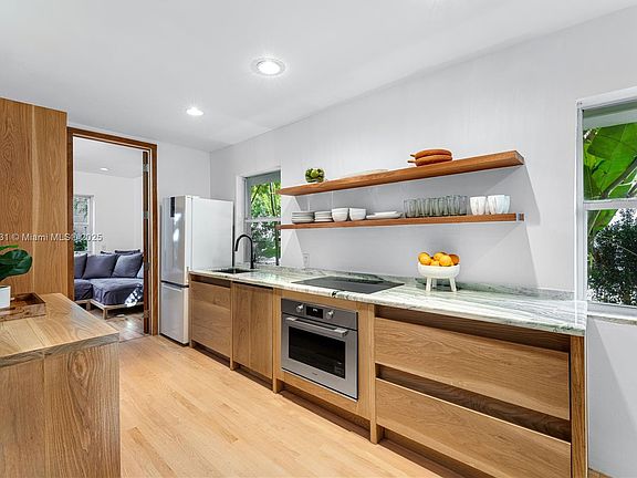 South of Fifth Beach Bungalow located on a premiere quiet block, nestled in a lush tropical botanical garden. This 2BD/2BA, 922 SF sanctuary blends natural textures with modern design. Warm white oak floors and Ipe wood walls create a serene, organic backdrop accented by Italian custom-built furniture and decor. The kitchen is a showpiece, featuring green marble counters, floating cabinetry, Blanco sinks, and a Fulgor Milano oven. The blue Spanish-tiled bathrooms with skylights evoke coastal Mediterranean charm, while the LG laundry area and Whirlpool dishwasher add everyday convenience. Experience true Miami Beach living in the heart of SoFi: a coveted area with short distance to world-class dining and the beach.