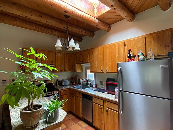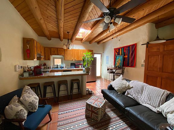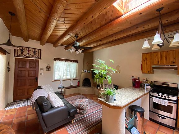 Sweet condo located right in the heart of Taos. This condo is set in the back of the complex away from street noise and in a beautiful, lush, green setting with a gated courtyard for privacy and security. This spacious one bedroom, one bathroom condo has been updated and is ready to rent for a minimum of a 6 month lease. Kitchen has granite counters, electric oven, dishwasher. Cozy, eat in bar area and enough room for a bistro table. There is a door to the outside patio for you to enjoy some sunshine in privacy. The living room has a nice built in desk nook located behind a barn slider door, this is a nice area to hide your work away. Living room has a working kiva fireplace and a wall mounted TV that will stay. The bedroom is huge, big enough for a king bed and plenty of storage with two large closets. The bathroom is beautifully upgraded with a massive walk in shower. There is an additional hallway/coat closet with plenty of storage. Everything you need just minutes walk to the plaza, restaurants, coffee shops, kit carson park and the lovely El Monte Segrado for cocktails. Rent is $1100 per month inclusive of water, sewer, trash, internet, cable, pest control...all you have to pay for is the electric. Coin operated washer and dryer located within the courtyard. Fully furnished available for $1250 per month OR some furnishings negotiable with the lease. Tenant responsible for electric. Owner pays for water, sewer, trash, internet & cable and pest control. No pets as per association rules, no smoking on premises.