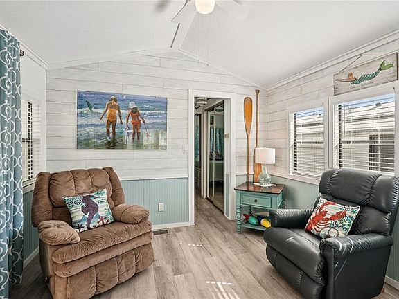 This fully remodeled and furnished 1-bedroom, 1-bathroom manufactured home is a fantastic opportunity for a second home, or permanent residence! Located in the gated 55+ community of Kings Gate Park, it is just 3 miles from Nokomis Beach! Situated on one of the highest elevations in the park and outside of a flood zone, the property includes land ownership and a low monthly HOA fee that covers cable, internet, water, sewer, and lawn care. Inside, this beach cottage-inspired retreat has been updated from top to bottom. Brand-new vinyl flooring runs throughout, complemented by modern window treatments, new front and back windows, solid wood cabinets in the kitchen, and updated electrical. The plumbing has been completely re-piped, and a new hot water tank ensures worry-free living. No polybutylene grey pipes! The beautifully updated bathroom features a walk-in shower with a sleek quartz countertop vanity, while the lanai, complete with new screens, extends your living space. For added convenience, the enclosed laundry area includes a new stackable washer and dryer. Outside, enjoy the privacy of a large green space beyond the newly installed paver patio—perfect for relaxing or entertaining. The spacious driveway provides ample parking for you and your guests. Beyond your home, Kings Gate Park offers an array of amenities to enrich your lifestyle, including a private boat ramp, RV and boat storage, a sparkling community pool, and courts for pickleball, tennis, and shuffleboard. With its prime location near pristine Gulf beaches, meticulous updates, and a vibrant community setting, this home offers the best of Florida living.