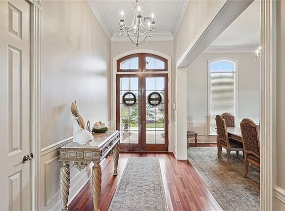 ** Nestled in a private gated community, this exquisite custom-built home is a treat. Step inside; soaring ceilings, a gas fireplace, and stunning Brazilian cherry hardwood flooring throughout the living areas greet you. The heart of the home is a chef's kitchen, with a large center island, abundant cabinet and countertop space, and a convenient pass-through to the living room. Adjacent, you'll find a spacious breakfast area and formal dining room that is great for casual meals and elegant entertaining. The primary suite is a true retreat, featuring an oversized bedroom with a cozy gas fireplace and elegant tray ceilings. The adjoining lavish bathroom is a spa-like oasis with dual vanities, a freestanding shower, and a large jetted bathtub. A generously sized closet provides ample storage for even the most extensive wardrobe. This meticulously maintained home offers four large bedrooms and three full bathrooms, providing comfortable accommodations for family and guests alike. The thoughtfully designed floor plan creates an ideal environment for everyday living and hosting gatherings. The backyard oasis boasts a "walk-in" gunite pool, a tanning ledge, and a heated spa for year-round relaxation. The fully fenced, oversized lot showcases lush tropical landscaping and overlooks the well-manicured golf course and tee box, offering serene water views of the pond. Practical features haven't been overlooked, with an expanded circular driveway providing ample parking for residents and visitors. A newer hand-nailed roof ensures peace of mind for years to come. This extraordinary property presents a rare opportunity to own a custom-built home that combines luxurious features, stunning views, and a prime location in a sought-after gated community. Don't miss your chance to make this remarkable house your home.