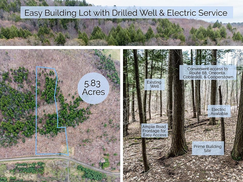 **Video available at theholscherteam.com** Are you ready to own your piece of secluded paradise? This land is prime for building with a well and electric already available and flat areas to install the septic and foundation. Surrounded by wooded lots, you'll find the privacy you're looking for with access to shopping and entertainment just 20 minutes away. This property is ready to be filled with memories of your own as you experience the best of Upstate NY. Located just three hours from Westchester and three and a half hours from NYC, this property is perfectly suited for your primary home, weekend getaways, lengthy retreats, or even income generating short-term rental. You'll find two State Parks less than 20 minutes away with many charming villages nearby. It is conveniently located near Cooperstown and Oneonta for easy access to shopping.
