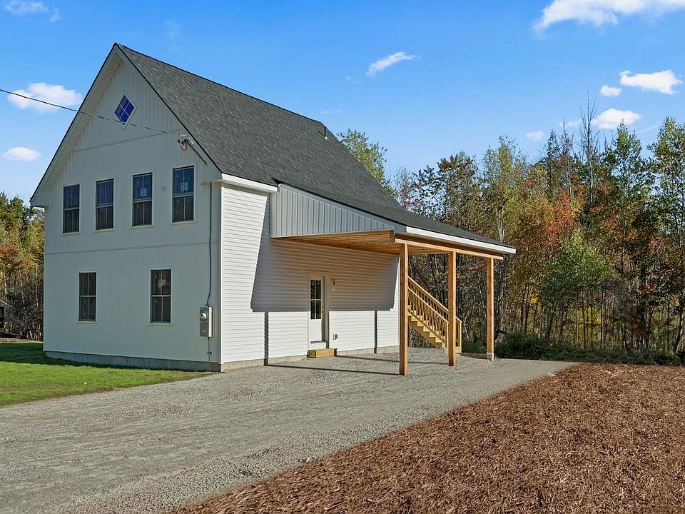 NEWLY BUILT, AND NESTLED AT THE FOOT OF HISTORIC STARKS MOUNTAIN, this 3-bedroom, 2-bath contemporary offers a bright, open floor plan and EASY ACCESS TO FRYEBURG’S MOUNTAIN DIVISION TRAIL (multi-use, including snowmobile access in winter). The upper level features an airy living and dining area with a gas fireplace and stone hearth, a well-appointed kitchen with access to a grilling deck, and a full bath. A loft provides flexible bonus space. The entry level includes high ceilings, three spacious bedrooms, and a full bath. All set on one acre and convenient to Fryeburg Village and Academy, North Conway and numerous resorts, trails, and amenities.