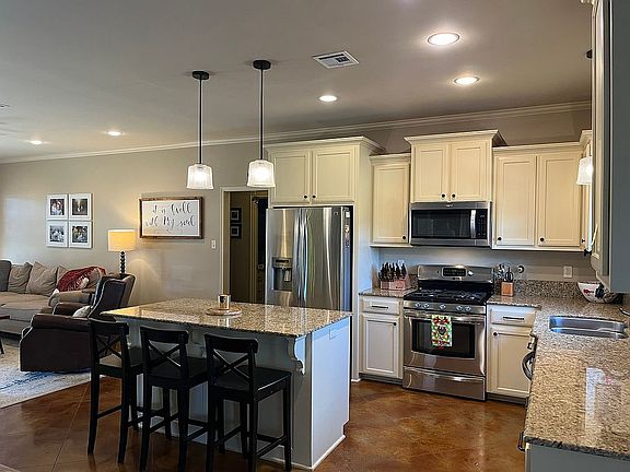 The open floor plan offers the perfect setup for family and friends to gather and relax. The master suite includes a walk in closet, shower, bathtub and his and her sinks. The two bedrooms on the opposite side of the house share access to a full bathroom. The kitchen and bathrooms feature granite counter tops and stainless appliances. Additional features include 9 ft. ceilings throughout, carport parking for two vehicles, utility room, walk in pantry, full front porch, back patio and spacious back yard.
