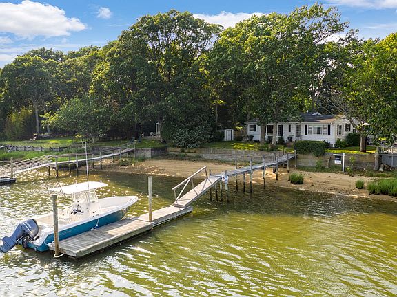 Sag Harbor Village Waterfront--140 ft (partially bulkheaded) with deep water dock. .80 acre (deep lot) VERY BUILDABLE! South-facing. Amazing 200+ degree views of Upper Sag Cove, the Steinbeck property and a stunning Bates/Masi new project on Long Point Road. 1950s Cottage has 2 BR and 2 BA, 2 fireplaces, Living room and family room. Basement, laundry room and attached garage. Detached studio and storage shed. Lovely deck overlooking the cove. Sunsets!