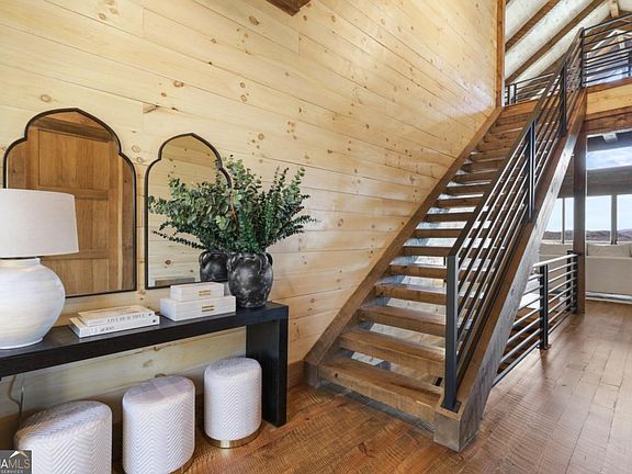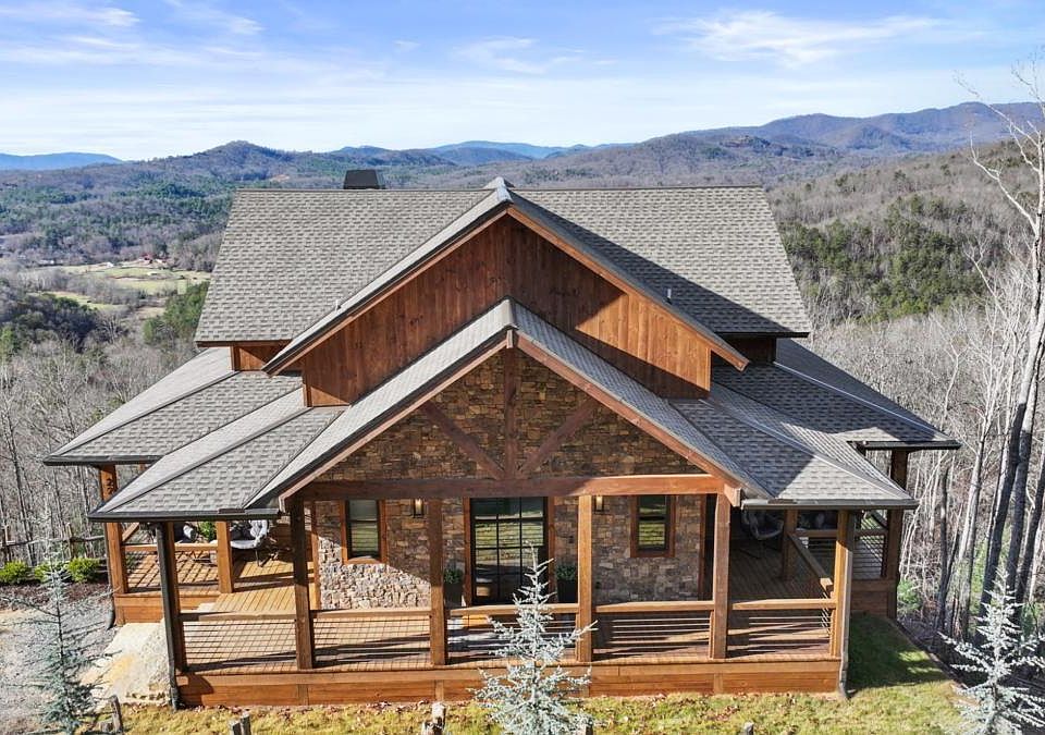 Sunset Ridge - Elevated Mountain Living in Mineral Bluff Set high on Roundtop Road with over four acres, Sunset Ridge offers sweeping views of the Blue Ridge Mountains and more than 4,200 square feet of finely crafted living space. The main level features a dramatic great room with floor-to-ceiling windows, vaulted ceilings, and a statement stone fireplace, flowing into a gourmet kitchen with dual islands, custom cabinetry, and high-end finishes. Four generously sized bedroom suites ensure comfort for family and guests, with two upstairs connected by a unique skywalk and private loft. The terrace level is designed for memorable gatherings-complete with a theater lounge, game area, wet bar, and fireplace-opening to expansive outdoor living spaces. Multiple decks, a fire table, and a hot tub provide opportunities to take in the sunrise, watch the sunset, or stargaze in the cool mountain air. Located just minutes from downtown Blue Ridge, Sunset Ridge blends refined design, exceptional entertaining spaces, and stunning natural surroundings in one unforgettable property.