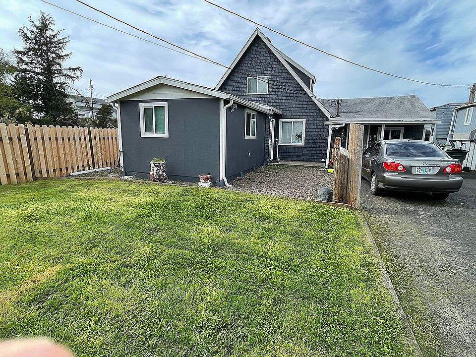 Owner carry or traditional finance. Possible rent to own. Must have downpayment. 5 bedroom, 2-bath cottage with bridge and bay views. Main 2 level house has 4 bd and 1 full bath. The attached ADU is 1 bd and 1 full bath. Walk to pier next door for fishing, crabbing, or clamming. Fenced yard with storage shed. It's a short walk to the beach, the jetty, the pier, Oregon Coast Aquarium, and all that South Beach has to offer. Beach and bridge view on concrete patio off living room.