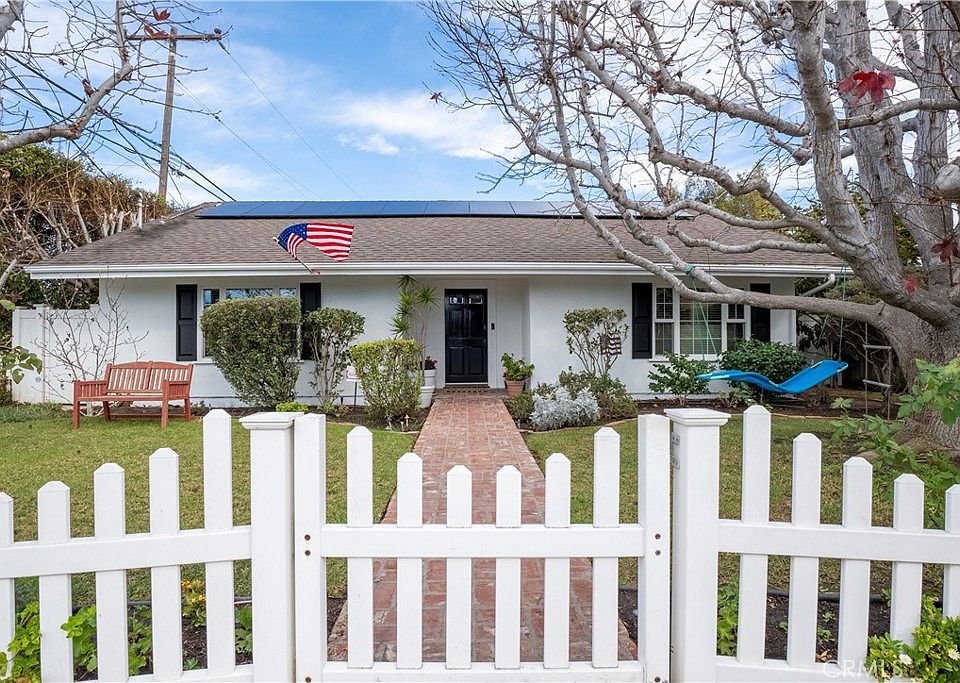 Welcome to 226 Santa Isabel, a charming cottage retreat featuring a delightful rose garden and a classic white picket fence located in the highly sought after Eastside Costa Mesa! This beautifully reimagined single-story home has it all! A large lot, 3 bedrooms, 2 baths, a front yard, a courtyard AND a nice size backyard with fruit trees, as well! The home is also equiped with Solar Panels, a Tankless water heater and an EV charger, too! Although, it all starts with the curb appeal that doesn’t quit! Featuring mature shade trees and a beautifully curated vibrant garden. Completing the idyllic curb appeal is the classic white picket fence. This picturesque outdoor area is the perfect welcome to your new home! Inside, you are greeted by beautiful cherry hardwood flooring, elegant crown molding & recessed lighting that flows throughout the entry, dining room and kitchen. The living room has a gorgeous tongue and groove ceiling with beams and a ceiling fan. The formal dining room opens to the courtyard through a French door with a large picturesque window with built-in shelves! The French-style kitchen features craftsman shaker cabinetry, bay and garden windows, and a cozy breakfast nook with tons of natural light! It’s equipped with a Viking gas stove & refrigerator and a double-drawer dishwasher. Not only does this well-planned home embrace separated living & sleeping quarters, which is ideal for shared living, but the primary suite is tucked away for ultimate tranquility! The luxurious primary suite offers a perfect blend of comfort and spaciousness, with cherrywood flooring, a ceiling fan, and a stunning en suite that is sure to impress. It is also awash with natural light from the beautiful French doors that lead to the courtyard. The primary bathroom includes a huge walk-in closet with custom shelving, a dual vanity, marble countertops, a separate shower, and a Roman bathtub with a ceiling-mounted bath filler! The full hall bath has an upgraded vanity. The 2nd bedroom features a huge walk-in closet, built-in shelves, cabinets, and a ceiling fan. And the 3rd bedroom has ceiling fans and wainscoting walls. This amazing location has you zoned for the top-rated Newport Mesa School District and is minutes to major freeways, 17th St., Newport Beach, Balboa Island, Fashion Island, OC Fairgrounds, John Wayne Airport, World-Class Dining, Shopping, Entertainment, Golf, Beaches and, of course, Newport’s natural treasure, the Upper Back Bay & miles of trails!