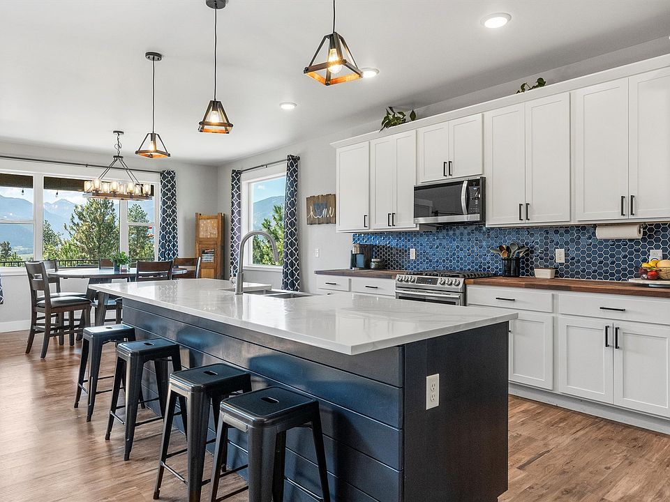 Stunning 4-bed, 3-bath custom home on 2 acres with sweeping mountain views! Crafted in 2019, the residence has 3,770 sq.ft. of finished living space plus a 2,318 sq.ft. unfinished basement with high ceilings, workshop area, and rough-in plumbing for a future bath. The main level offers a striking kitchen with a beautiful blue tile backsplash, a magnificent quartz island, and open flow to the dining and living areas. The exposed wood beam, lofty ceiling, gas fireplace, open balcony and mountain views create a warm and inviting atmosphere. The main floor primary suite is just off the living area and includes a spacious bedroom with two walk-in closets and a luxurious ensuite with a deep soaking tub, tiled double shower, and dual vanity. A second bedroom, guest bath with tile shower, laundry, and mudroom complete this level. Upstairs features two large bedrooms, full bath with dual vanity, second laundry, work nook, and a massive family/rec room. Extras include 3-zone central AC/heat, 3-car attached garage, fenced backyard, UG sprinkling, raised garden beds, lower level patio, and elevated/covered deck for taking in the breathtaking beauty of the Bitterroot Valley!