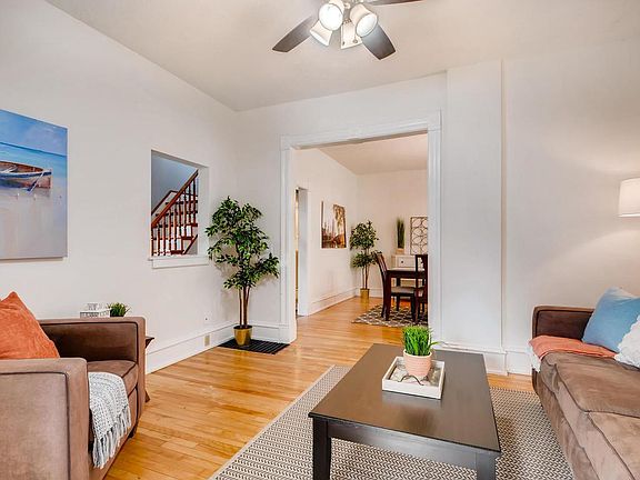 Charming home with old world charm. Original hardwood floors and high ceilings throughout the main level of the home. Spacious living room with French doors leading into an airy south facing 3 season front porch with abundant windows and hardwood floors. Enjoy the large kitchen with updated appliances and a main floor laundry. Cozy, private back yard with deck.