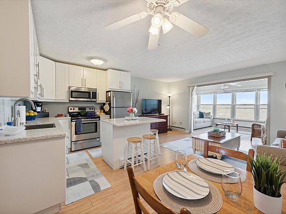 Waterfront condoFully remodeled kitchenSunroom windowsSunroom with comfortable couchOpen air stairwell