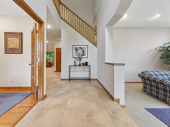 tiled floors. The staircase continues to a lofted area that is railed and open to the foyer. From the main level downward the abundant space continues again with a wing providing walkout access, and two bedrooms with separated by a full bath. Home proceeds to lowest level and offers a rec room with electric fireplace, daylight windows, kitchenette, 5th bedroom, three-quarter bath, wet sauna, storage and utilities.