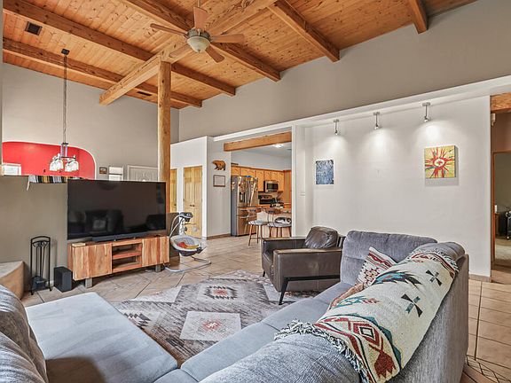 Dramatic high ceilings adorned with gorgeous wood beams as your enter this amazingly cared for home. The large great room has a wood burning kiva fireplace that add a cozy and elegant feel to this gathering space. Kitchen has granite countertops, farm sink, lovely subway tile backsplash and stainless steel appliances. Large dining area with adjacent nook, perfect for an office space. Large primary bedrooms has separate sliding door to the backyard patio. Large walk in closet, jetted tub and double vanity. Secondary bedroom is large enough for kids to share:) Great front courtyard that wraps around to the low maintenance backyard. Beautiful beamed covered patio, turf, fire pit and privacy. Private gated community for added serenity. New roof in 2019 and new HVAC in 2020. Absolute doll!