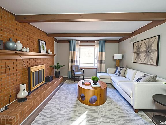 Full-wall brick natural fireplaceModern finishesStylish cabinetryPrivate backyardGarden boxesFresh paintInviting family room