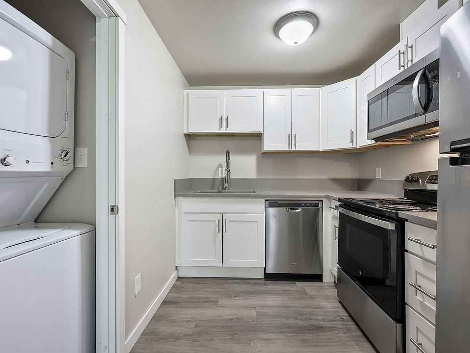 Our newly remodeled 2-bedroom, 1-bathroom units are a great value featuring upgraded cabinetry and countertops, stainless steel appliances and full-size washer and dryer. Our community features a covered parking space FREE with each home.