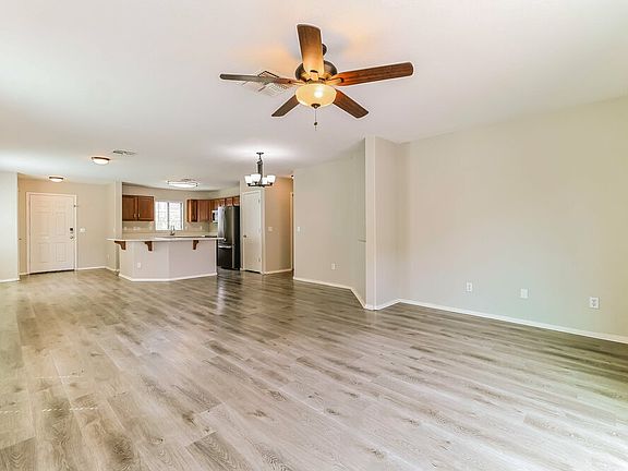 Featuring a three-car garage and a fenced-in backyard with a large patio, this Apache Junction, AZ rental home sports three bedrooms, two bathrooms, and one of the most unique front entrances on the block. An eat-in kitchen, complete with a wooden cabinet set, complements a French-door refrigerator, a modern stainless steel dishwasher, and quartz countertops with a kitchen island. The living room sports dome lighting, vinyl plank flooring, an attached dining room area with a chandelier, and a lighted ceiling fan next to double doors that lead to the backyard. Inside the master bedroom, a walk-in closet with convenient shelving provides a ton of wardrobe space. The main bedroom's attached bathroom comes complete with a crescent-shaped tub and several medicine cabinets. Fill in your application today!