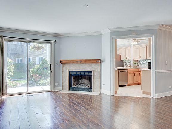 First floor ranch condo in school distinct 203. 2 Bedrooms, 1 bath and an attached 1 1/2 car garage. Big eat-in Kitchen with oak cabinets, Quartz tops, SS appliances and sliding glass door to the covered patio. Living room with a wood burning (gas fired) fireplace. There is a large dining room adjacent to the kitchen. Both living room and Dining room have crown molding and Pergo flooring. Large master bedroom with a walk-in closet, plus a normal 6'0" closet and a shared bath. Washer/Dryer hook-ups are in the unit. Easy access to a private 1 1/2 car garage. FYI New tub and enclosure will be completed in the near future.