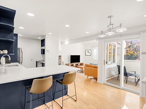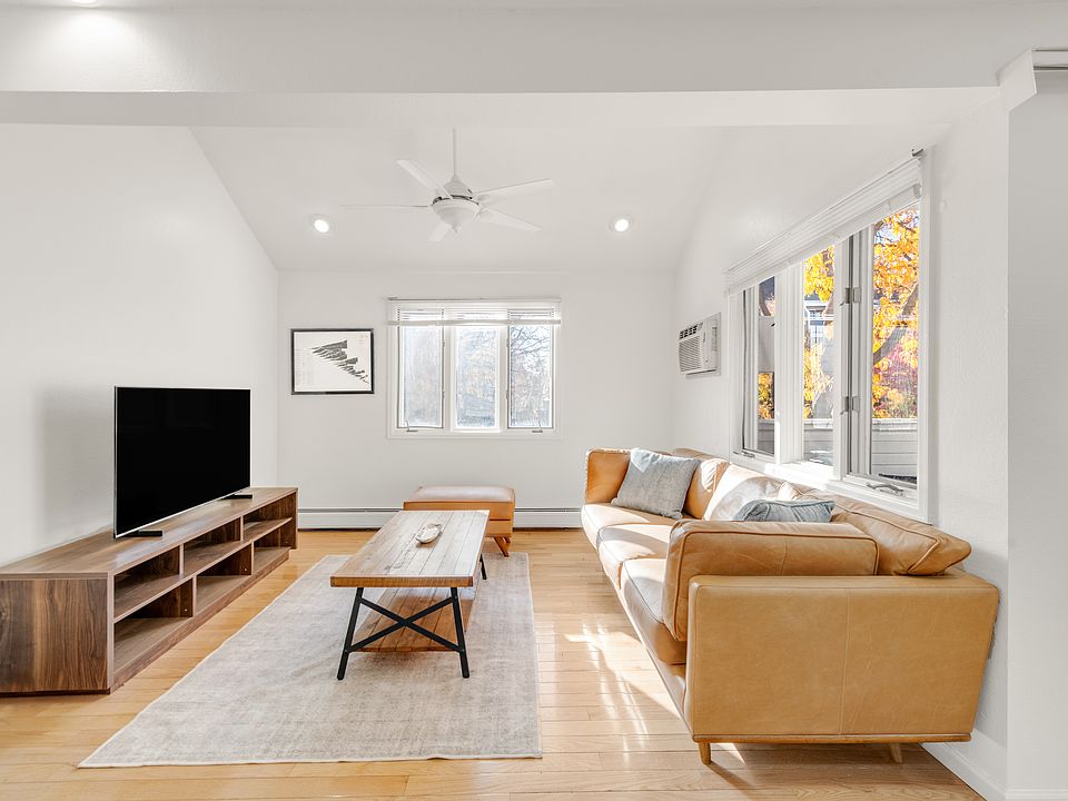 Incredible Whittier location, FULLY FURNISHED, all utilities included, just one block from Pearl Street's vibrant East End! Walk to top restaurants, coffee, Whole Foods, and shops. This 2-level condo features a bright, open floor plan with wood floors and a spacious living area, complete with a leather West Elm sofa and smart TV. The kitchen has quartz counters and a breakfast bar. Upstairs boasts a king bedroom with a large closet and private bath, plus an additional balcony. Enjoy peace and quiet in this well-situated, convenient retreat. Includes air conditioning on both levels. Reserved off-street parking.