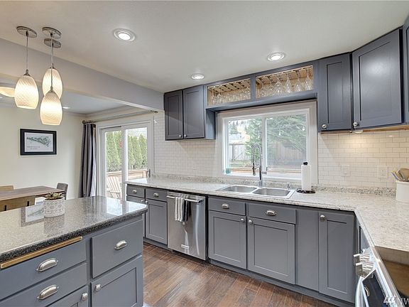 Light & bright remodeled 2-story in Bothell. 4 bedrooms, 3 baths, rec room & bonus living area. Beautiful remodeled kitchen with stainless appliances. All new engineered hardwood flooring, vinyl windows, woodwork, doors & updated lighting. Fully fenced, private & level rear yard perfect for entertainment, pets and play. Pellet stove in living room. Upper floor bonus room. Versatile 4th bedroom or home office. Central location just minutes from 405, I-5, shopping and restaurants. Move-in ready.