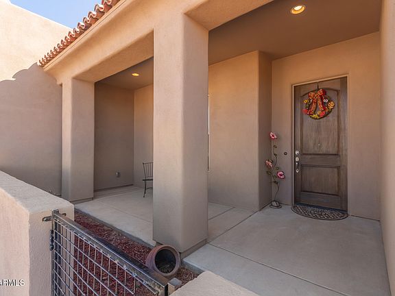 This charming, territorial-style home sits on over an acre of fenced, horse-ready land, complete with round pen, shaded corral, Connex box and plenty of space for trailers and RVs. Inside, you'll find generously sized bedrooms with large closets, ideal for year-round living or extended stays. The open kitchen features granite counters, stainless steel appliances, rich cabinetry, and a breakfast bar. The living and dining spaces are warm, inviting, and perfect for entertaining. The primary suite offers backyard access and a spa-like bath with dual sinks, soaking tub and walk-in closet. A spacious second en-suite bedroom adds extra flexibility for guests or multigenerational living. Perfectly positioned for horse owners, rodeo enthusiasts or snowbirds looking for a peaceful desert retreat