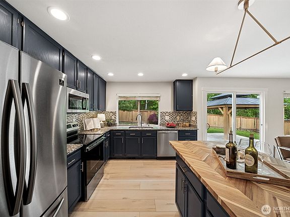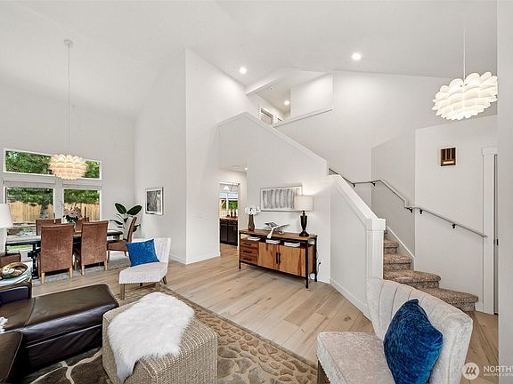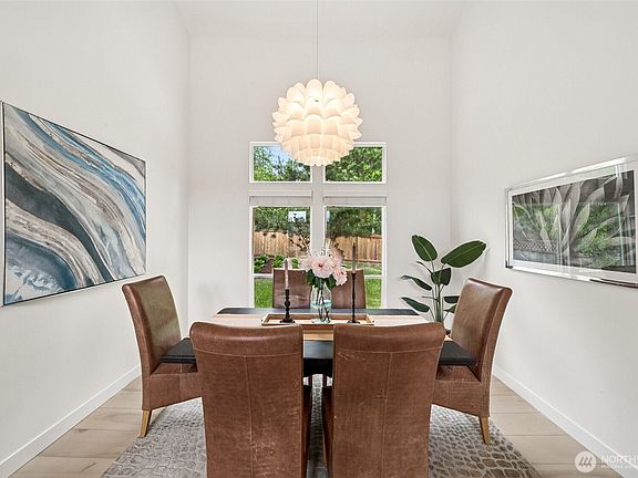 This home represents a rare blend of light & bright, contemporary spaces with lush, natural greenbelt privacy. A highly versatile main floor is perfect for formal dining or casual entertaining with central air. A covered patio with pull down movie screen wows. The kitchen has plenty of storage with a peninsula for dining. The vaulted ceilings & large windows amplify the space, bringing nature inside to inspire relaxation. A secluded primary with ensuite adds to the quiet comforts. It also boasts a 3 car garage with high ceilings for storage and room to tinker. It is a short walk to Soos Creek Trail or to the private neighborhood park with basketball court. A prime location for commuting, this home wins on all accounts! Tour today!