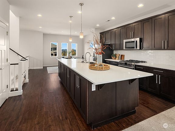 Nicely situated to capture views of Olympic Mountains. Desirable Bothell location on safe cul-de-sac with playground out the front. Open kitchen features stainless-steel gas stove, upgraded 42 inch cabinets with soft close, quartz countertops & entertainment island with side cabinets for ample storage. Living room features a modern floor to ceiling gas fireplace, perfect for cozy nights at home. 2018 construction feels brand new so you can move in worry free. Convenient study/den located on the lower level w/ 3/4 bathroom. Primary bedroom and two additional bedrooms upstairs. Landscaped yard backs to trail and is just minutes to Canyon Park shopping area with new PCC grocery. Northshore School District.Pre-inspected for your peace of mind.