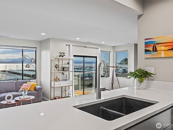 Stunning Penthouse end unit condo. Panoramic views of Des Moines Marina, Puget Sound and Cascade Mtns. Meticulously updated throughout with local interior designer. Quartz countertops w/undermount kitchen sink and stainless appliances. Tinted windows to cut down on UV and heat, central ac to keep you cool. No shared common walls! Primary bathroom features heated floors, walk in closet, lots of storage, double vanity with makeup area w/lighted mirror. Custom walk in shower w/full tile and glass. 2nd bedroom features a murphy bed with storage. Close walking distance to the beach, marina, or the downtown shops/restaurants. Take in the beautiful sunsets from this condo. HOA includes high speed internet, cable, water, sewer and garbage.