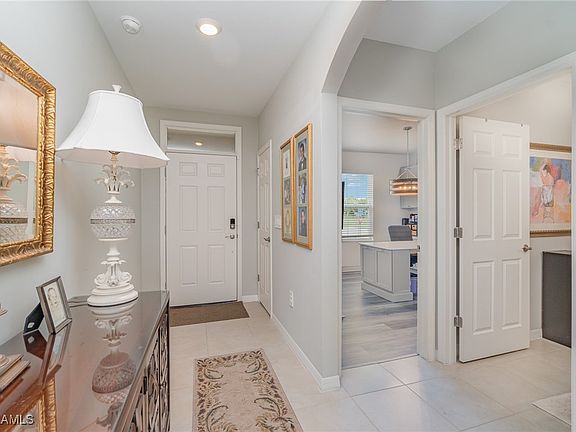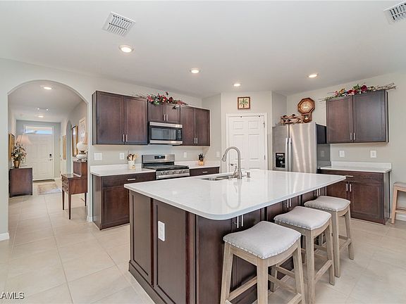 Welcome to this "almost new" beautifully designed, meticulously maintained home, situated on a spacious corner lot in Alva, with no hurricane damage and no flood zone worries. This residence is enhanced by lush, irrigated landscaping, a widened paver driveway, and an extended open paver patio. Designed with convenience and security in mind, the exterior features a whole-house reverse osmosis water treatment system, keyless entry on both garage and front doors, LED corner lighting, a Christmas-ready outdoor outlet, an extended lanai, a Ring doorbell, and a comprehensive security system with three exterior cameras. The home is smoke- and animal-free, ensuring a pristine environment.