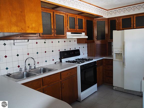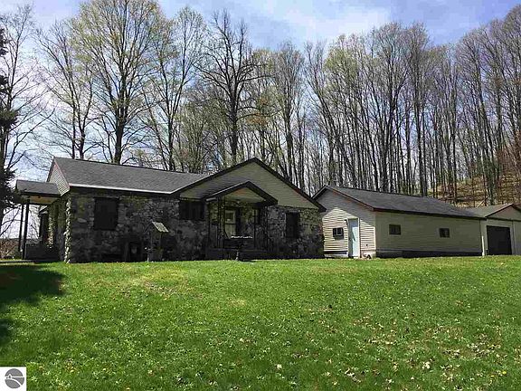 Delightful hilltop setting for this stone cottage right out of a fairy tale book. 3 BR ranch home on 1.5 acres has village amenities including sewer, natural gas and cable. Ready for your updates and personal touch this home features custom made and designed birch kitchen cupboards, faux stone surround gas fireplace & bay window. Home is very economical to heat. Updates include new boiler & water heater. Features include easy landscaping and large deck with a 30 x24 oversized heated & insulated garage with workshop and a 44x30 pole barn w/12 ft door for all the toys and equipment including your camper or boat. Also a camper electric and sewer hookup. Great location near Honor. Close to the Sleeping Bear Dunes National Lakeshore and Lk Michigan, Platte Lakes and River, State land, many golf courses & skiing.