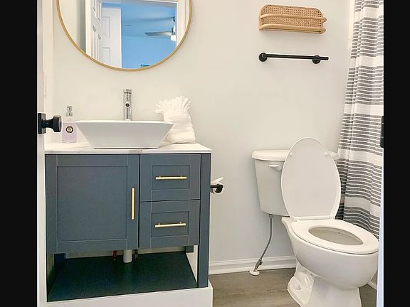 The spacious primary suite is fitted with a cozy king bed and has a full bathroom attached that is also accessible from the hallway. The secondary bedroom has a queen bed and en suite full bathroom.